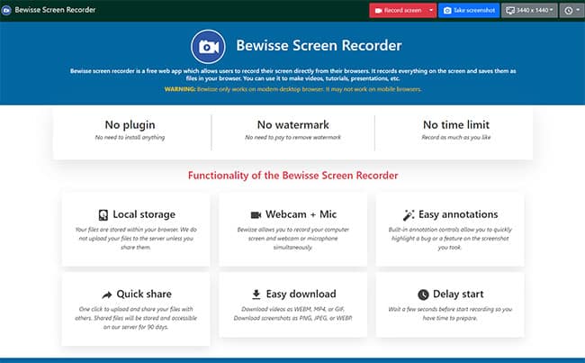 The final entry in our list of screen recorders for Linux is Bewisse. Bewisse screen recorder is a completely free online tool that allows users to record their screens without the need for any downloads or installations. It can record your entire screen, and there are no time limits or watermarks to worry about.