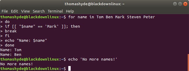 for name in Tom Ben Mark Steven Peter do if [[ "$name" == 'Mark' ]]; then break fi echo "Name: $name" done echo "No more names!"