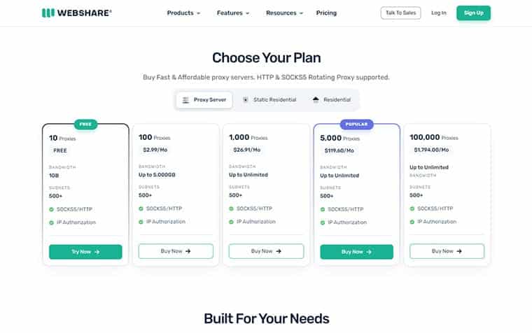 - Free Plan: 10 proxies with 1 GB of bandwidth at no cost.