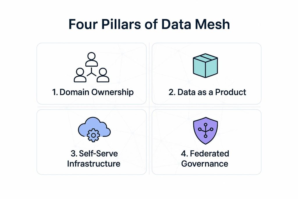 Data as a Product treats data like any other product with users, quality standards, and lifecycle management. Domain teams ensure their data is discoverable, well documented, and trustworthy.