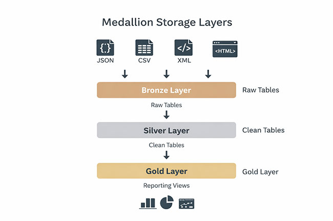 Bronze layer sits in object storage, partitioned by ingest date and source system. Raw data goes here in whatever format it arrived, from JSON blobs and CSV files to entire HTML dumps. You don’t transform anything at this stage. This layer exists so you can always go back and reprocess from scratch when your parsing logic changes or when a vendor quietly alters their export format.