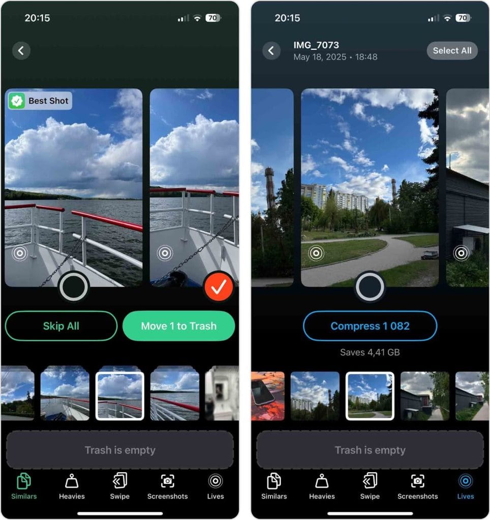 We recommend that you try Clever Cleaner, a free iPhone cleaner app that’s designed to free up gigabytes of space in just a few minutes. It uses built-in AI to automatically detect and remove duplicate photos from iPhone, including resized versions and similar-looking images that the Photos app often misses in its Duplicates album.