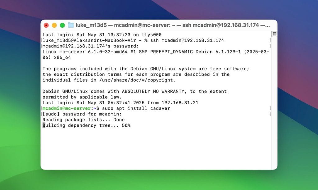 Note: In the following methods, the terminal shown in screenshots will be from macOS. That’s only because we’re connected to our Linux Debian PC via SSH, which lets us take clear screenshots directly from the screen, instead of photographing the physical monitor. All commands are executed on the Linux machine.