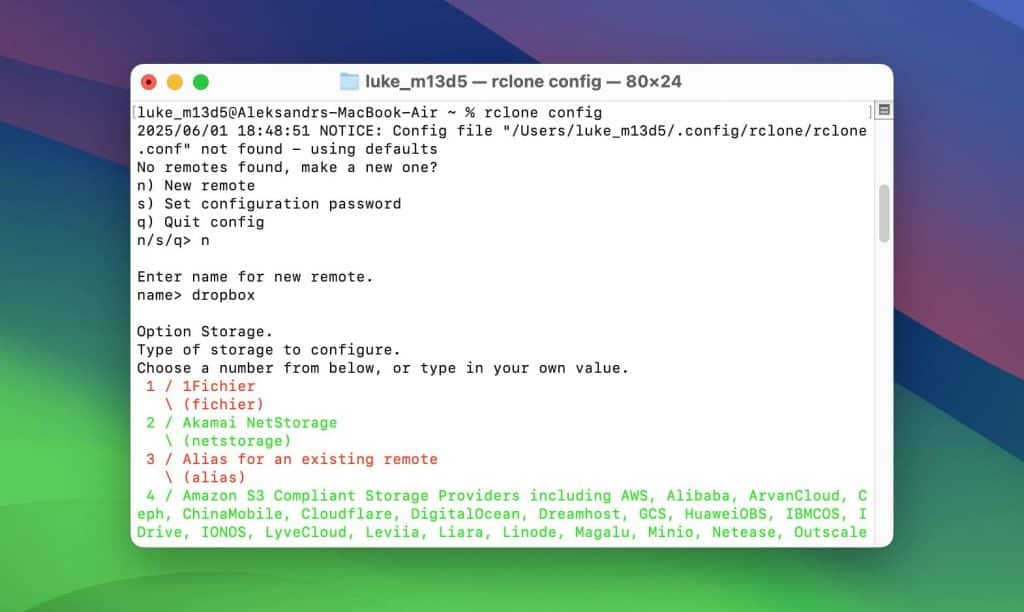 - Run rclone config on the machine with a browser by typing the command: rclone config. Choose n to create a new remote, name it (e.g., dropbox), then select Dropbox from the list of supported services.