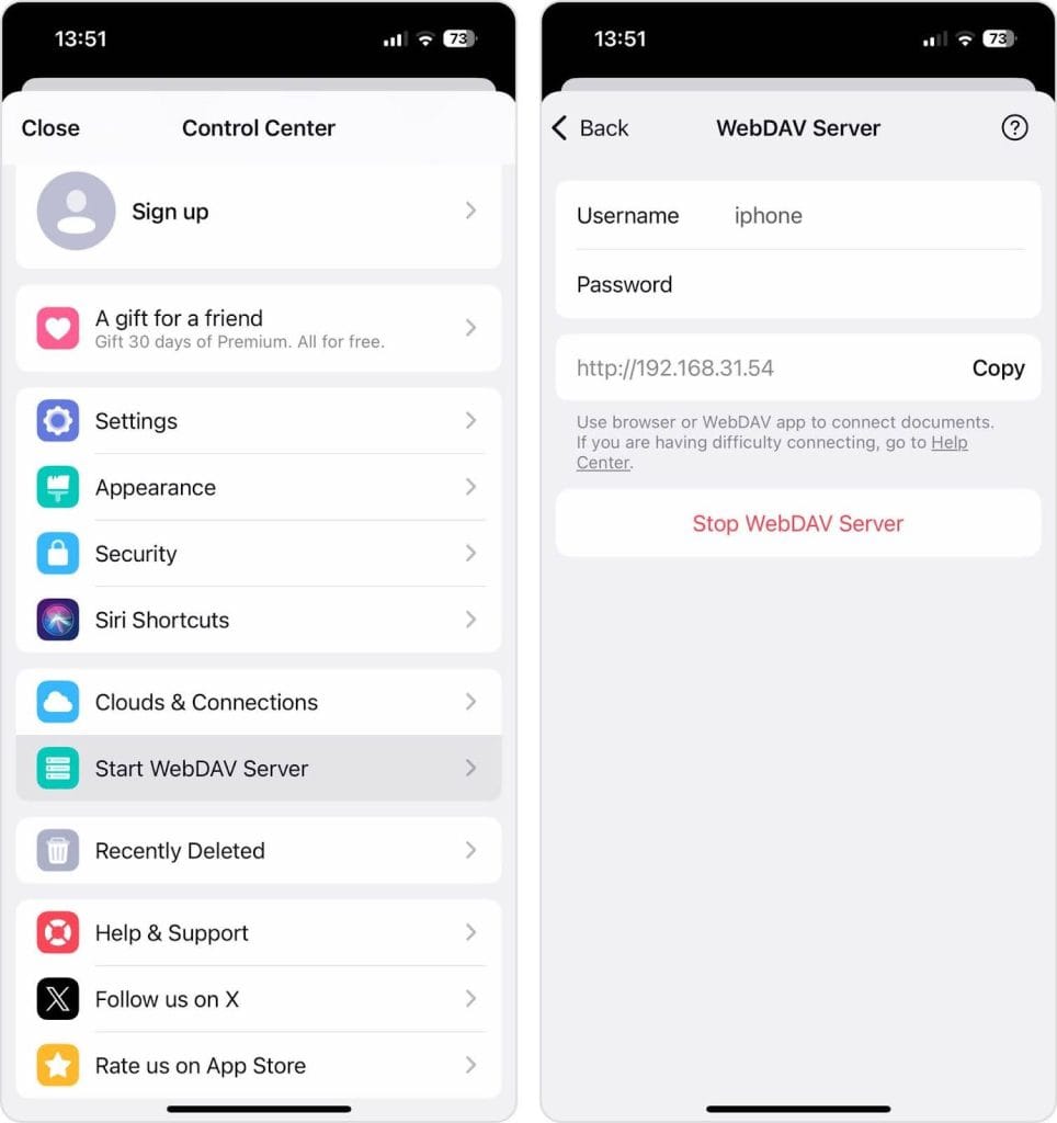 One of the most reliable ways to send files from Linux to an iPhone is by turning your iPhone into a WebDAV server, and the Documents by Readdle app makes this possible with minimal setup. While Documents is technically a freemium app, the WebDAV server feature is available in the free version, so there’s no need to purchase a subscription just to transfer files.