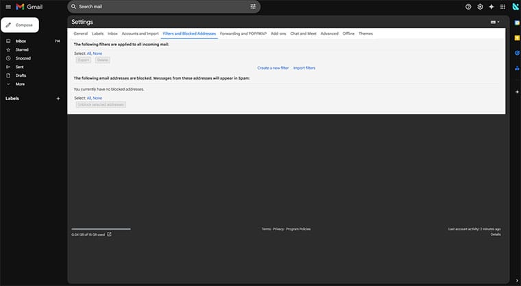 Head to Settings > Filters and Blocked Addresses to set up your first line of defense. I’ve found that dangerous files often hide in common attachment types, so start by creating this essential filter: