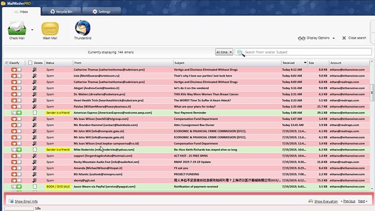 Pre-delivery email scanning separates Mailwasher from standard spam filters. It examines your incoming messages before they reach your inbox, using pattern-based phishing detection and Bayesian filtering to catch sophisticated threats. The system learns from your email patterns, continuously improving its accuracy. It also integrates with custom blocklists, allowing you to delete spam before it touches your inbox.