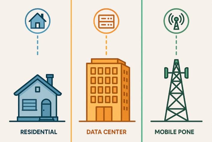 | IP Source | Real ISP-assigned home addresses | Data center servers | 3G/4G/5G cellular networks |