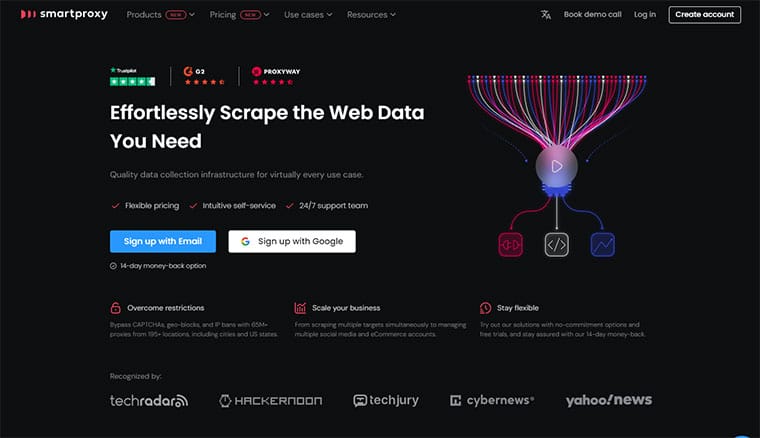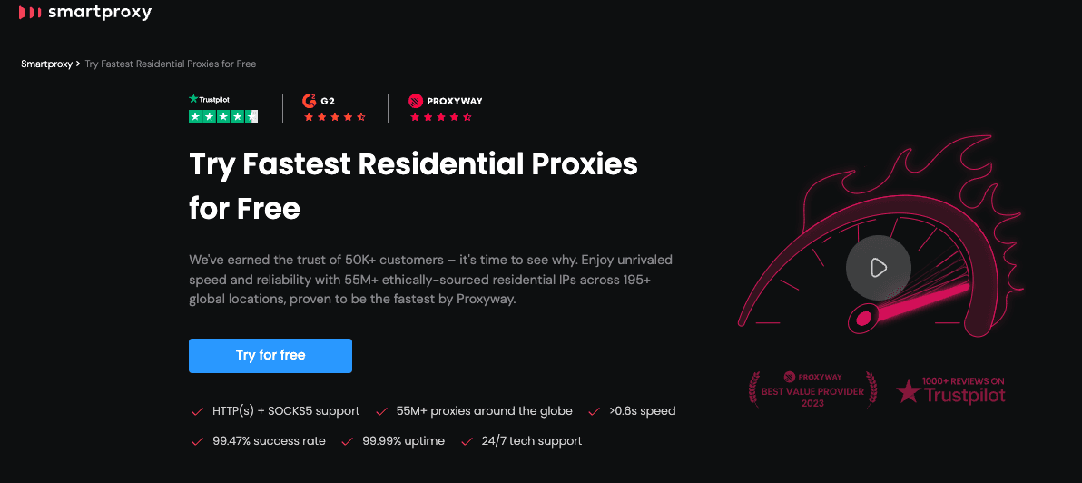 Founded in 2018, Smartproxy is now an industry-leading proxy service provider that has grabbed a huge market share due to its cutting-edge, inexpensive, and useful proxy solutions that include residential proxies, datacenter proxies, mobile proxies, static residential (ISP) proxies, Site Unblocker, several web scraping APIs, and free tools for personal, business, and commercial demands.