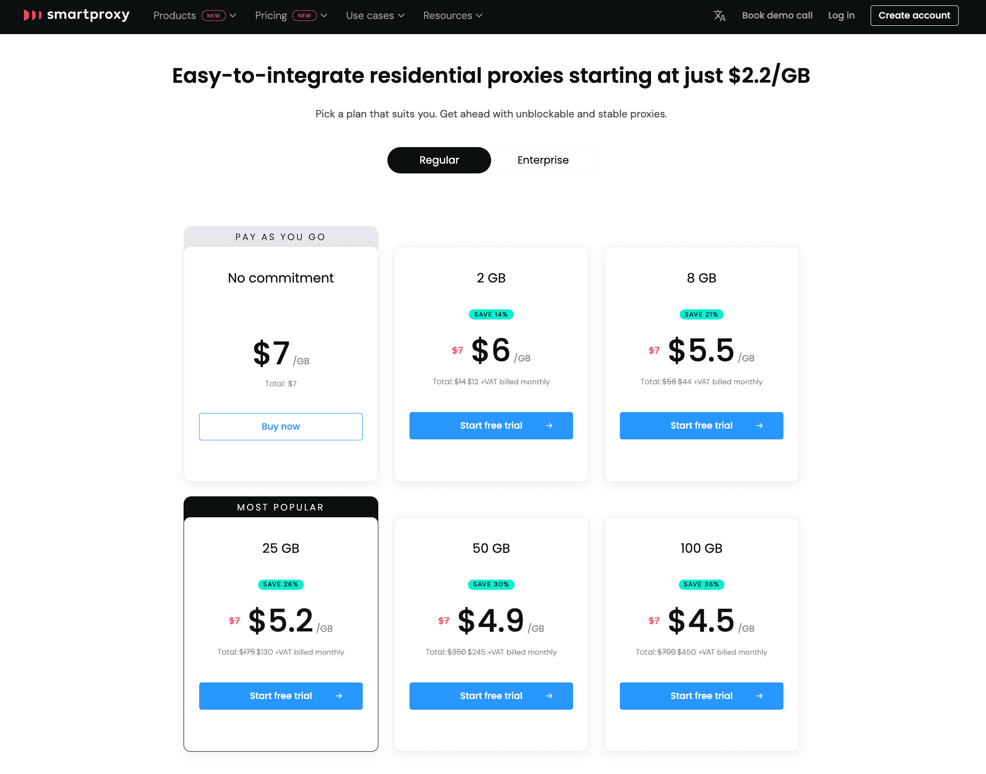 Smartproxy offers several different price plans for datacenter, residential, mobile, and static residential (ISP) proxies. Important to note is that residential and mobile proxies include a Pay As You Go option, while other plans are priced based on a monthly subscription model and come with limited bandwidth but you still get access to thousands if not millions of IPs or unlimited bandwidth in case of dedicated datacenter proxies and static residential (ISP) proxies.