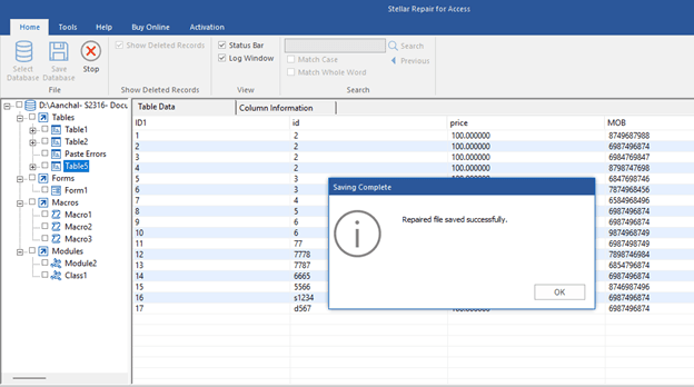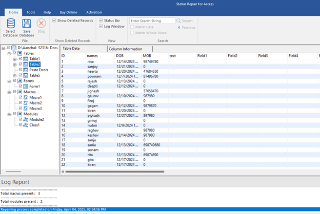 Stellar completed the scan in approximately 8 minutes and successfully recovered 100% of the database objects with all relationships intact. The recovered database opened without errors in Access 2019.