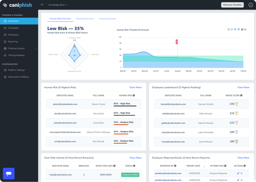 - Engagement is built in. With badges, streaks, and leaderboards, employees often say they look forward to the next phishing email, because it feels like a game.
