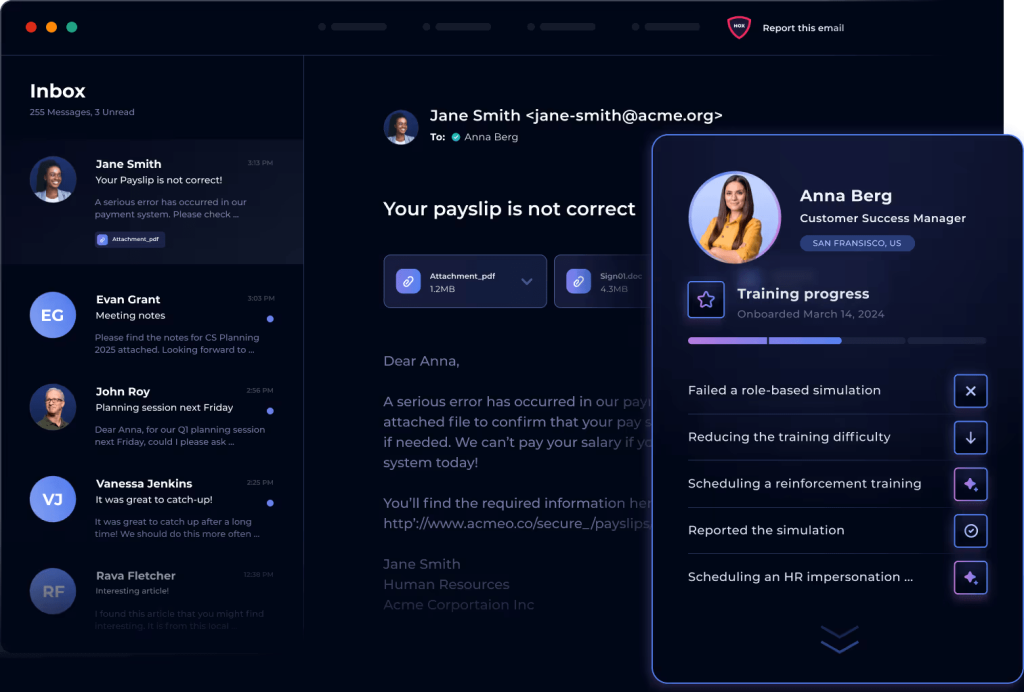 - Every mistake becomes a micro-learning moment. If you click on a shady SMS or deepfake video, Hoxhunt gives you a quick, relevant training snippet right then and there.