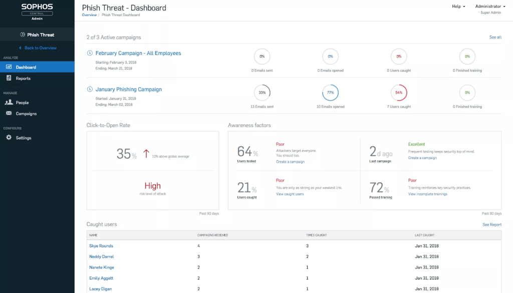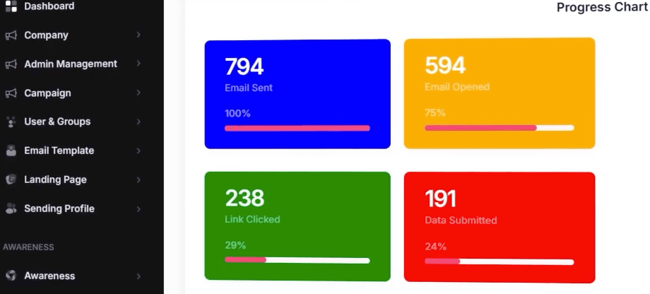 - Dashboards let you track how many users click, how many report phishing, risk trends, days since the last campaign, coverage, etc.
