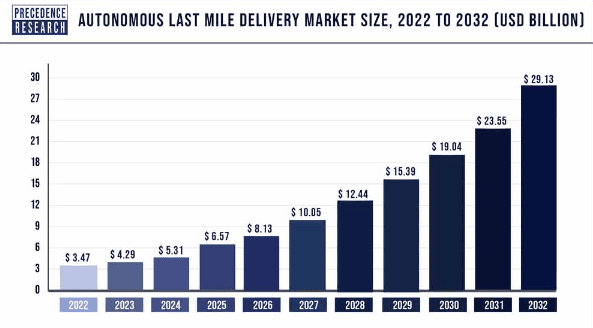 Last-mile delivery accounts for 53% of total transportation expenses. Drones and self-driving cars provide a practical substitute for pricey driver services. By 2032, the autonomous last-mile delivery industry is expected to grow at a compound annual growth rate (CAGR) of 23.71% and reach $29.13 billion.